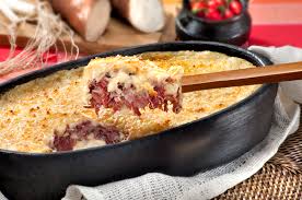 2- Colocar a carne seca, as fatias de mussarela, e por cima o purê.